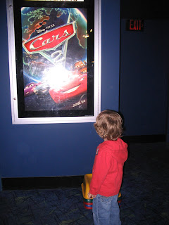 This weekend Asher saw his first movie in the theatre! Well, technically he's been before as a baby to the Mom and Baby movies at our local theatre, but this was his first real movie for him in the theatre. We saw Cars 2. Cars is his all time favorite movie, as most of you already know. It was only playing in 3D and I wasn't sure how Asher would do with the glasses, but he did great. We went with some friends of ours, and sent the dads early to get us seats (it was a sold out show). Here are some photos of the event...